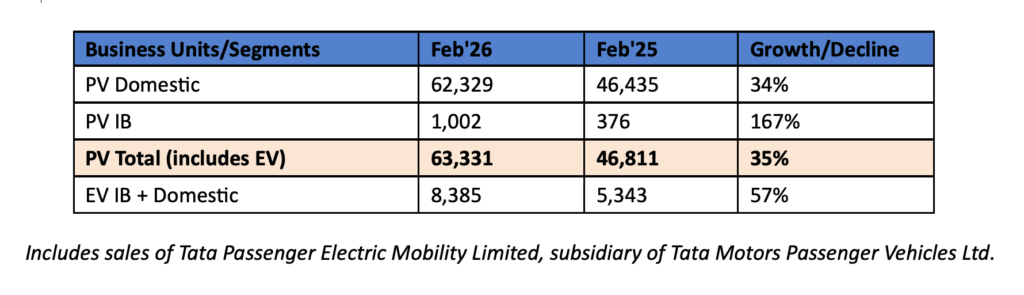 Tata Motors Passenger Vehicles Ltd. sales in the domestic & international market for February 2026 stood at 63,331 units, compared to 46,811 units during February 2025, up